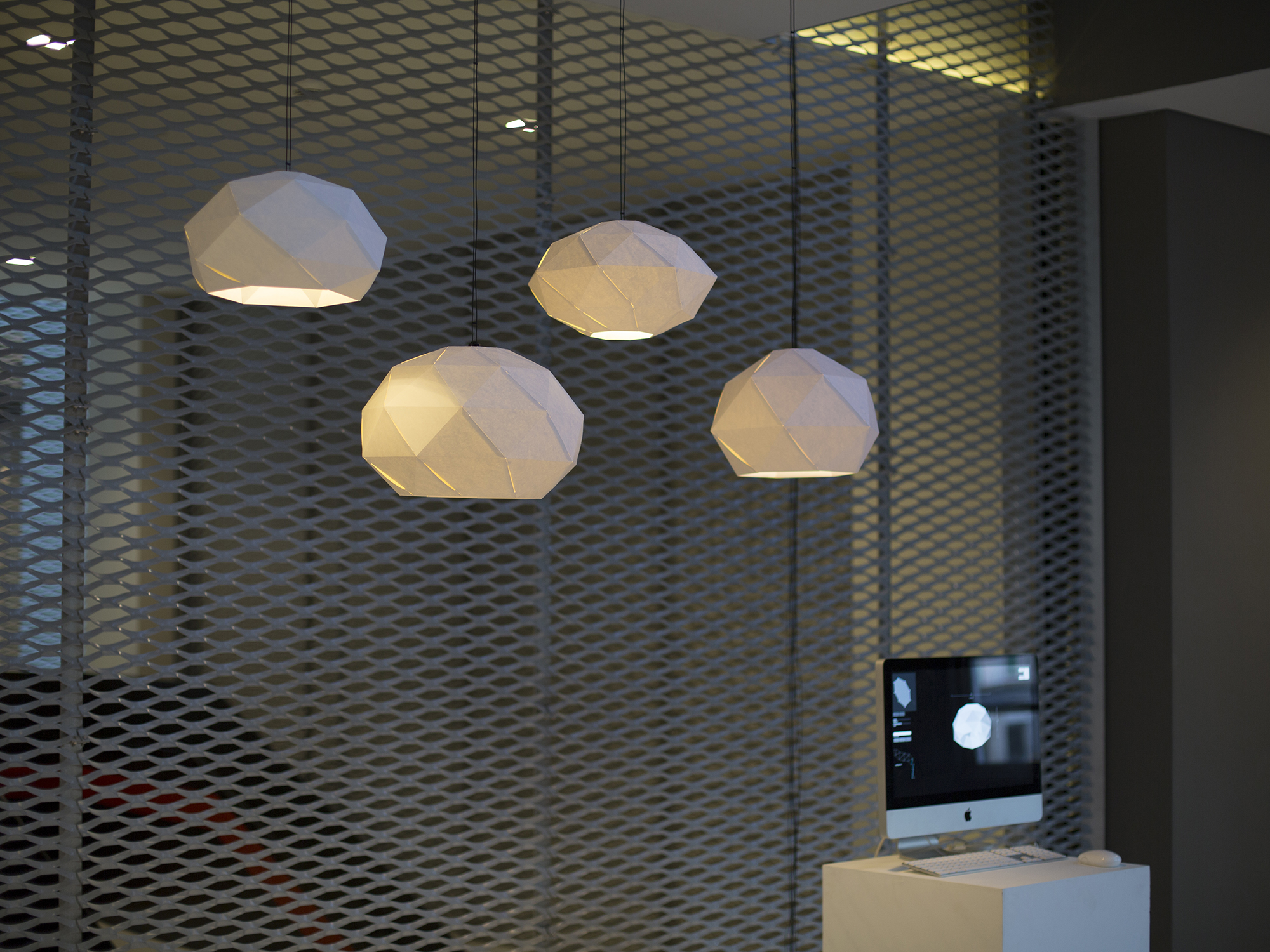 A pendant lamp digitally fabricated from sheet materials. This design explores a mass customisation system, whereby the design, fabrication, and distribution of the artefact can be carried out within a local context. Via a graphical user interface, one can manipulate the form and scale of a Torus Lamp. The resultant toroid form serves as both light reflector and diffuser, while securing itself to the bulb. The algorithm then unfolds the modules required, generating the drawings required for fabrication via two-axis cutting or die-cutting.